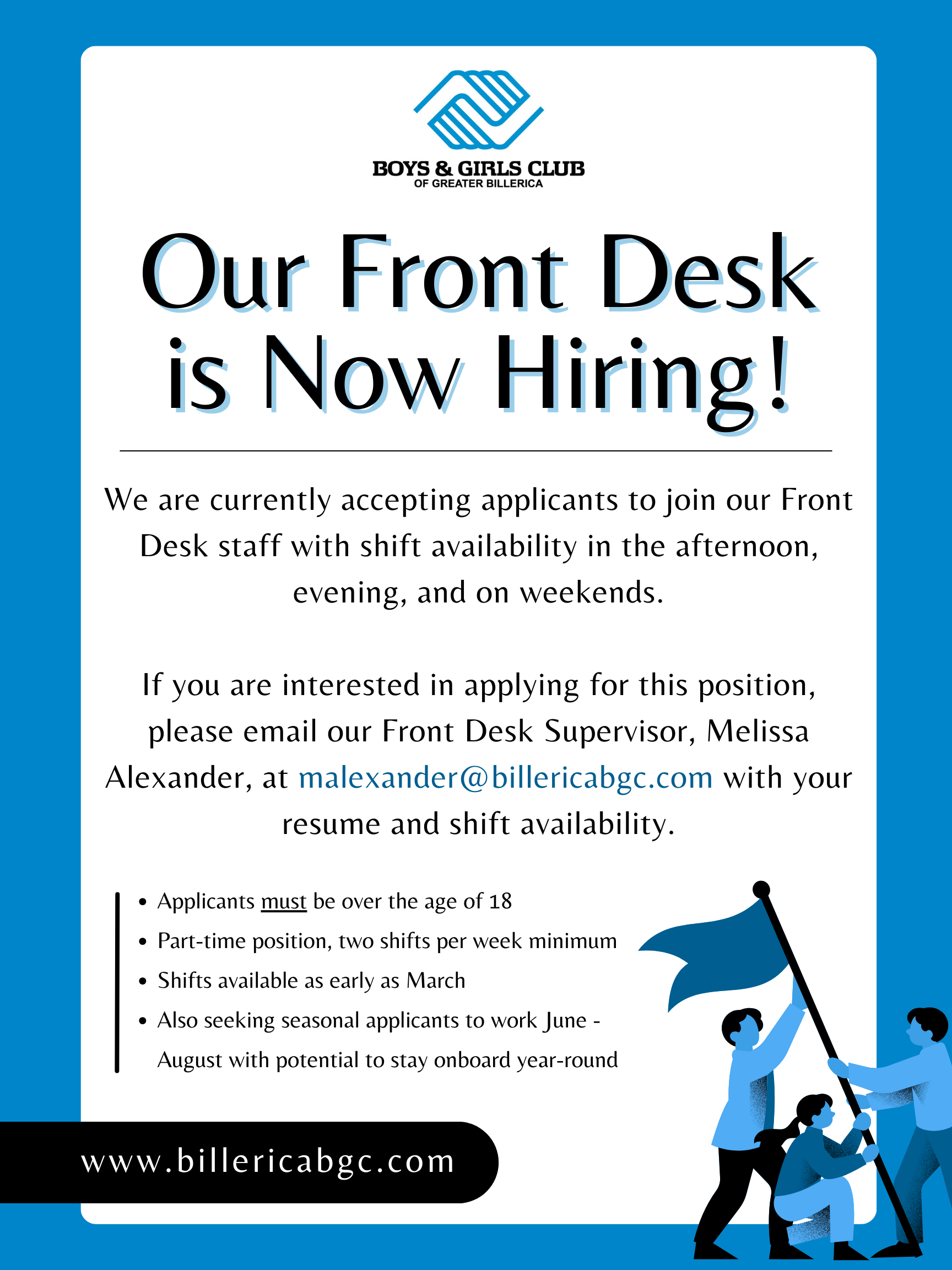 Boys & Girls Club of Greater Billerica is continuously seeking motivated candidates eager to make a positive impact in our community! The Club seeks individuals to join a team that is dedicated to empowering youth & teens.